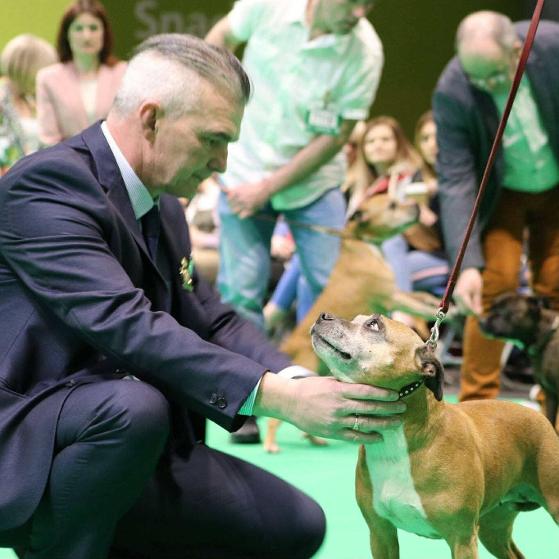 Martin was born in South Wales, in Crickhowell. At the age of seven, he moved to Scotland, where he remained until he was 27, before eventually returning to Wales. His involvement with Staffordshire Bull Terriers began by mistake. Originally, Martin had wanted a Bull Terrier, inspired by Bodger from the Disney film The Incredible Journey. However, his father came across a litter of Staffordshire Bull Terriers instead, and that chance encounter marked Martin’s first introduction to the breed. His first Stafford was called Storm (The Duke of Zilabra), and Storm was not just a dog or a pet, but a best friend. With memories cherished and shared, Stom became the name behind the affix he proudly carries today — Stormstaff. Martin first began showing in 1984. After getting married, the family decided to have a dog as a family pet, and a Staffordshire Bull Terrier was the only breed that was going to come into the home. So a Stafford it was, and after attending handling classes, Martin entered the show ring for the first time with his Stafford Sam (Stormstaff Telegram Sam). Showing started as a slow-burning hobby, as he would equally love to run his dog across the beaches and in the mountains in Wales. Martin has bred 3 litters, from which came Stormstaff Sky’s the Limit, who was BOB at Crufts. Martin also handled CH Stormlodge Anne Bonny to her crown and had a CC awarded to Stormstaff Rose of Mooncoin. Martin turned his attention to judging, and after being talked into doing so, he thought he would give it a go and see if he liked it! And in 1988, he officiated at his first show for Carmarthen and District Canine Society. His passion for judging soon outweighed his drive toshow, and some 400 dogs later, he received his first championship show appointment at The Potteries in 2004. Since then, he has gone on to judge in excess of 2,000 dogs, gaining extensive hands-on experience in the breed. Martin has awarded 14sets of CC’s at 10 different Championship Shows. Overseas, Martin has had the pleasure of judging in Australia, America and Ireland twice each and in France, Holland, Norway, Sweden, Germany, the Czech Republic and Hungary. Martin’s long-standing involvement with Staffordshire Bull Terriers at breed club level began in 1986 when he became a member of the Staffordshire Bull Terrier Club of South Wales. In the early 1990s, he joined the Western Staffordshire Bull Terrier Society, where he has served as Secretary, Chairman, Treasurer, and in many other roles over the years. His dedication and hard work for the club have been unwavering, and he remains an integral part of the Western Staffordshire Bull Terrier Society today. Along the way, Martin has been influenced and inspired by mentors, including Bryn Cadogan (Dogan) Ken Davis, and Anne Gatenby (Kerrisdale). Some of his fondest memories of shows include socialising, learning from respected breeders and judges, and enjoying a beer or two along the way. Martin has achieved a judging diploma with distinction from the animal care college run by David Cavill and has spoken at breed club seminars for the Potteries SBTC, Morecambe Bay & Cumbria SBTC and his very own Western SBTS.The Staffordshire Bull Terrier is something truly special to Martin. He deeply admires the breed’s heritage, its history, and the challenges it has overcome over the years. His respect for the breed and its future remains close to heart. Away from Staffords, Martin enjoys a Currey and is a Motherwell FC Supporter. Martin's time within the breed is one of dedication and commitment, and with in-depth knowledge comes experience spanning over decades. It is well deserved that Martin has the opportunity to judge at the very top, and I am sure the day will be a memorable andenjoyable experience for him to look back