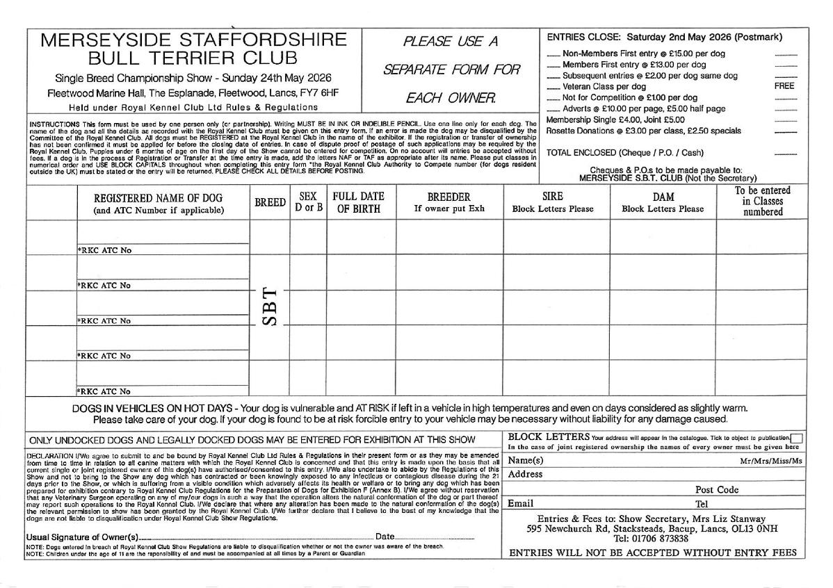 Once Downloaded and filled in please hand back to Liz Stanway with correct amount of cash at any UK show